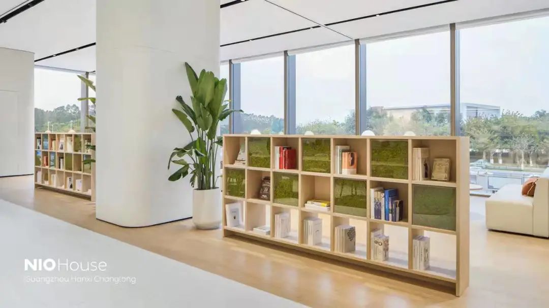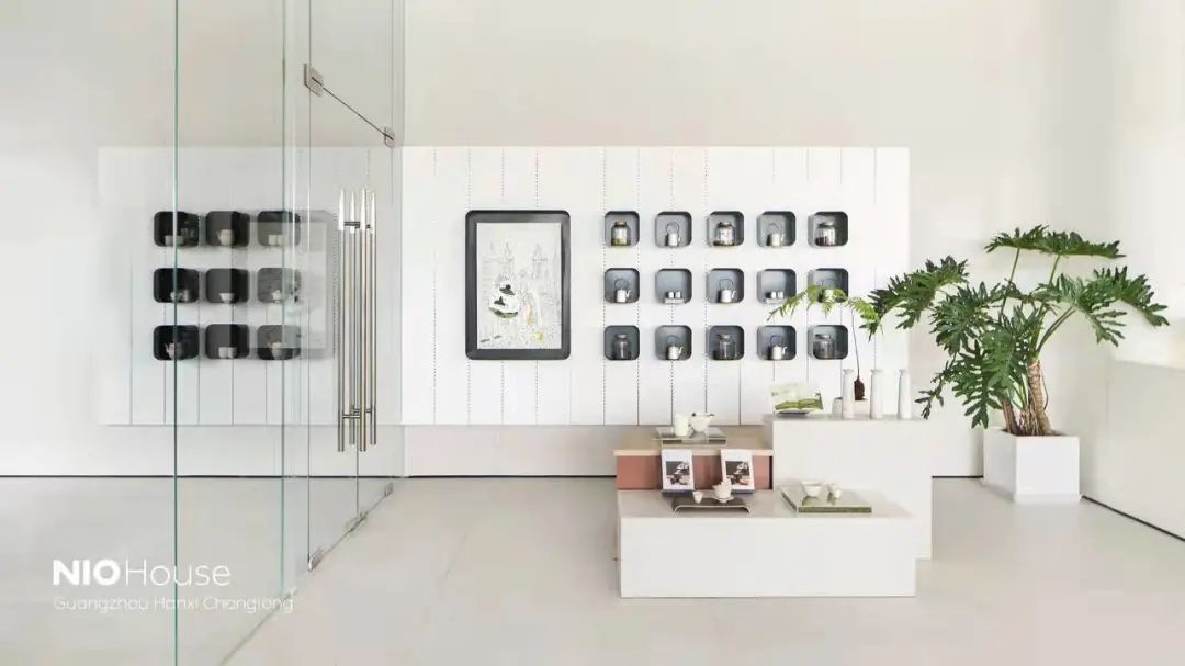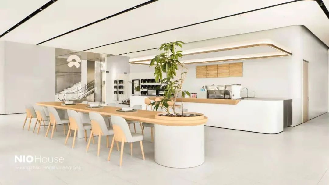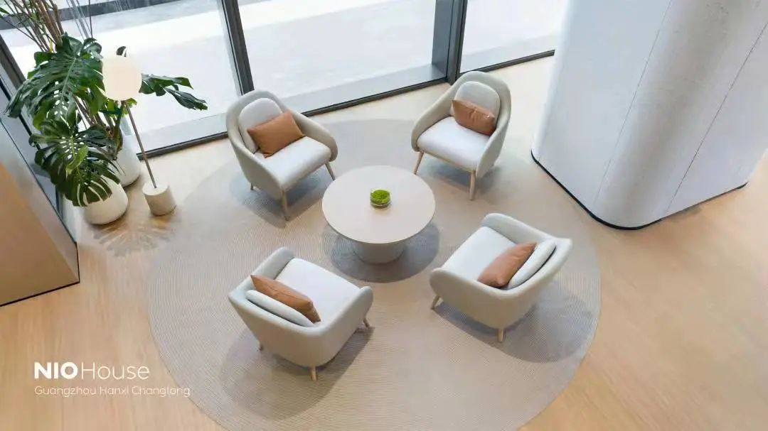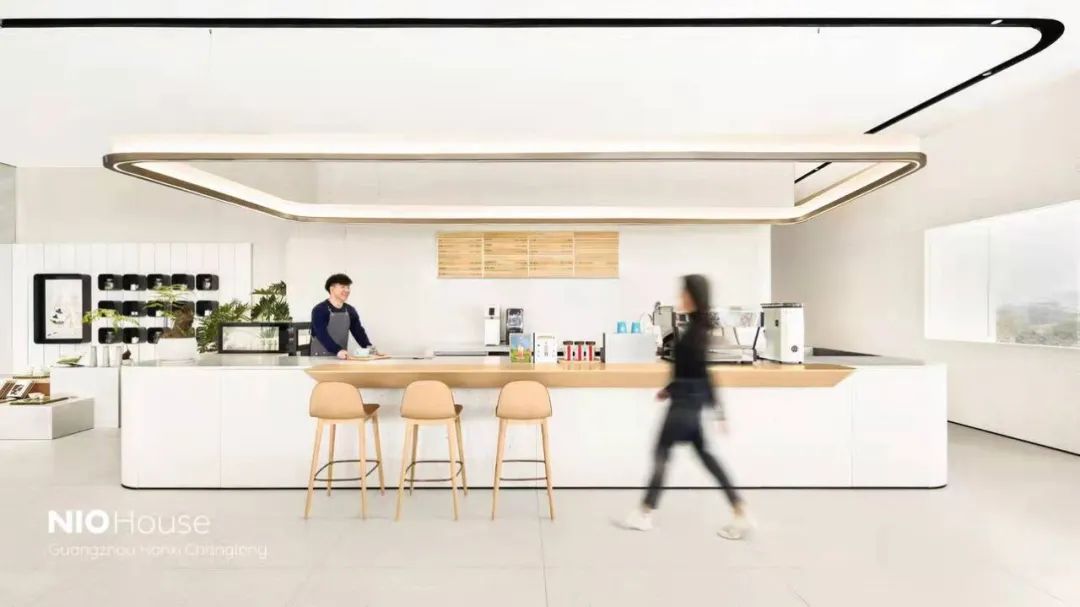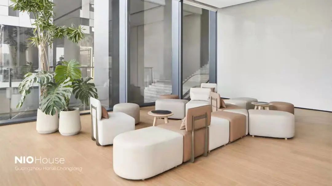 蔚來中心·廣州漢溪長隆牛屋采用2層結(jié)構(gòu),展廳一如既往地采用蔚來純粹、精致、科技感的風(fēng)格,整體以米白色為主,不銹鋼鏡面頂面、水磨石墻面,搭配實木飾面設(shè)計,空間更加通透,更具未來感。