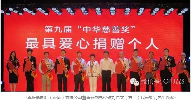 9月1日,第九屆“中華慈善獎“頒獎典禮于江蘇省南通市新區(qū)會議中心隆重舉行,香港中華總商會會長、真維斯所屬旭日集團(tuán)董事長楊釗憑借多年來對公益慈善事業(yè)的不懈投入獲此殊榮。中華人民共和國國務(wù)委員王勇接見了第九屆中華慈善獎獲獎代表并合影留念。