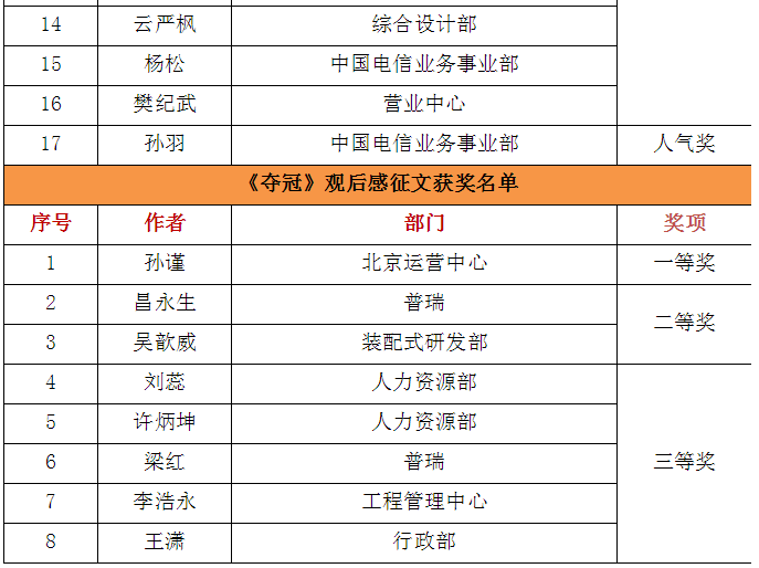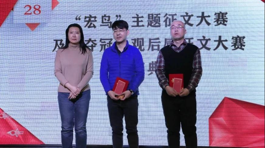 作為兩場(chǎng)征文比賽的評(píng)委之一,常宏品牌推廣部總監(jiān)張英宣向大家介紹了這兩場(chǎng)征文比賽的評(píng)選規(guī)則以及大致情況。常宏“宏鳥(niǎo)”征文大賽自征集以來(lái),共征集了174份參賽作品,經(jīng)過(guò)初評(píng)、復(fù)評(píng)、公示,共評(píng)選出了一名一等獎(jiǎng)、兩名二等獎(jiǎng)、三名三等獎(jiǎng)、十名鼓勵(lì)獎(jiǎng)以及一名人氣獎(jiǎng)?!秺Z冠》觀后感征文從87份作品中,共評(píng)選出了一名一等獎(jiǎng)、兩名二等獎(jiǎng)以及五名三等獎(jiǎng)。