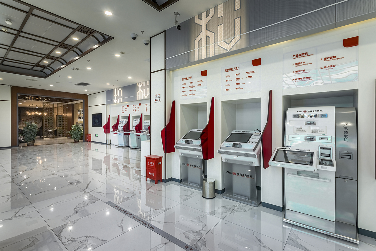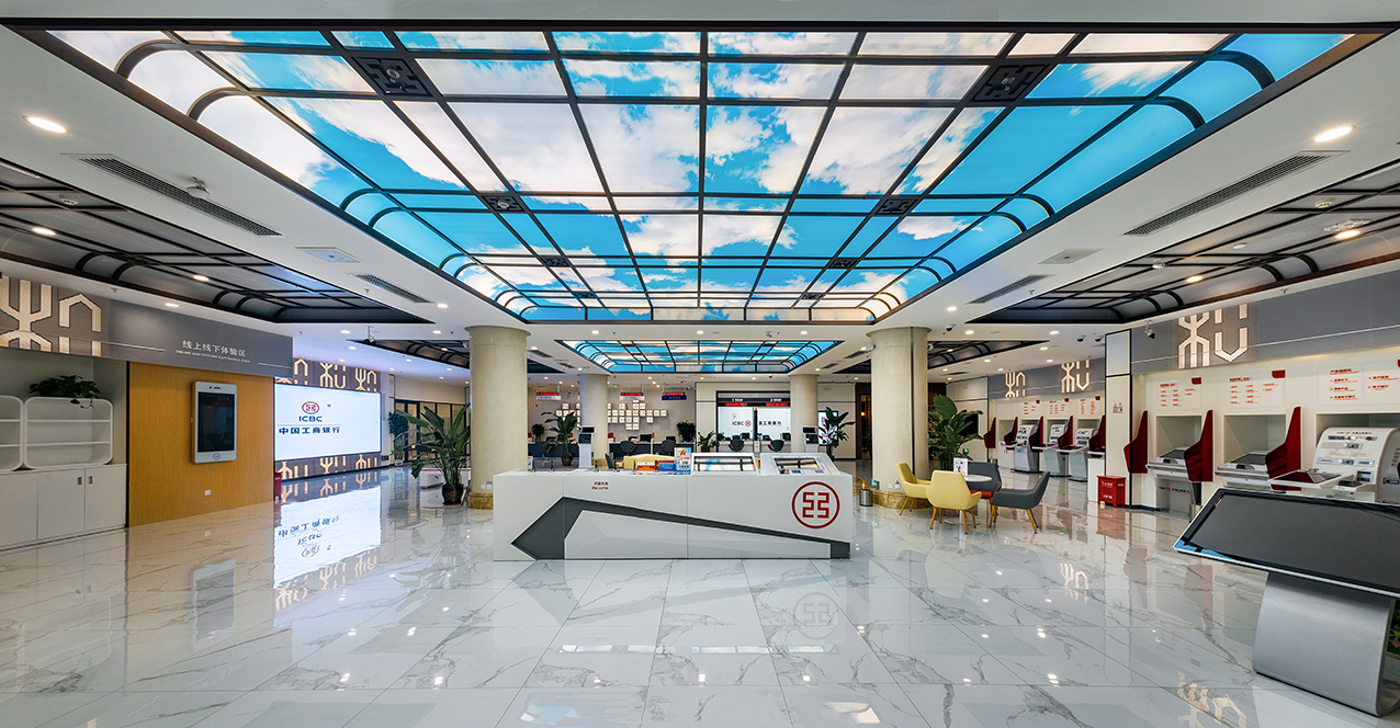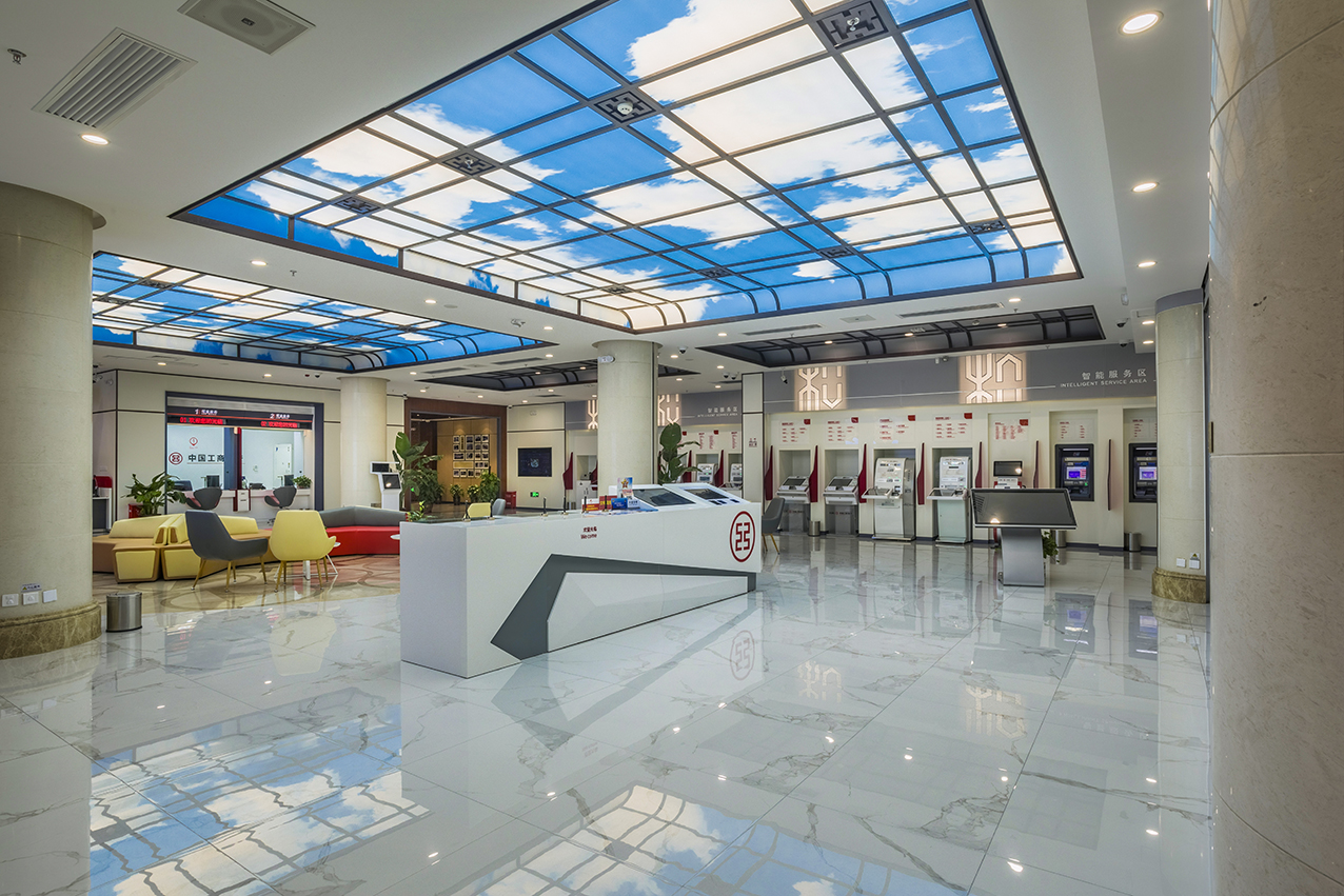 中國工商銀行和平支行坐落于石家莊CBD中心商務(wù)區(qū),是一個全新的智能化網(wǎng)點(diǎn)。該網(wǎng)點(diǎn)圍繞“智慧廳堂”建設(shè),室內(nèi)燈光、空調(diào)、照明等采用智能環(huán)控系統(tǒng),玻璃隔斷采用可智能調(diào)節(jié)通透度的霧化玻璃,打造出一個科技、智能、舒適的現(xiàn)代化銀行營業(yè)場所。