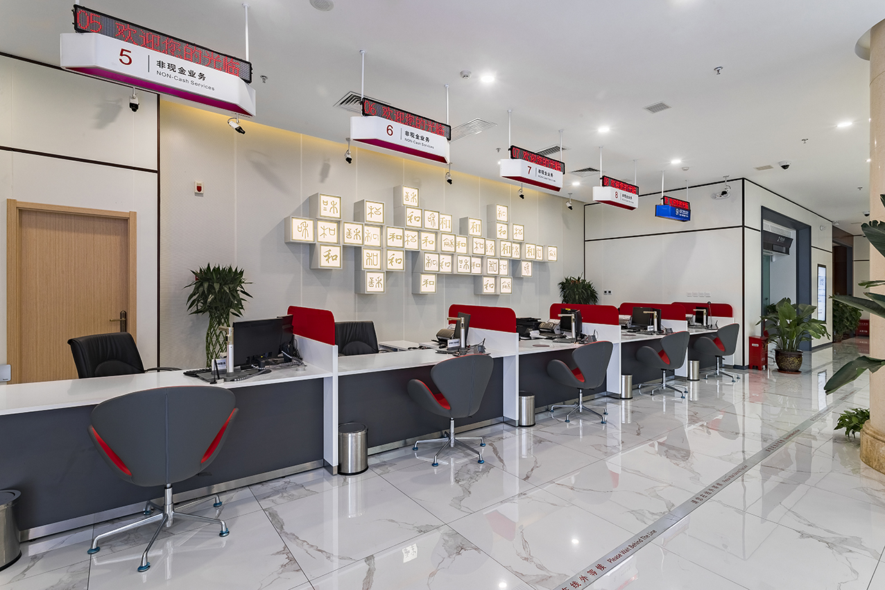 在設(shè)計上,和平支行以“和”為設(shè)計主題,將“和”字元素融入到營業(yè)廳內(nèi)部空間,打造“網(wǎng)點(diǎn)+文化”的特色營業(yè)廳。“和”字蘊(yùn)含了平等共事、和諧共處、多樣共存、合作共贏等普世價值觀。傳統(tǒng)文化與智能化的結(jié)合,使和平支行充滿了新的生命力,代表了和平支行的工作態(tài)度和對顧客的服務(wù)態(tài)度。