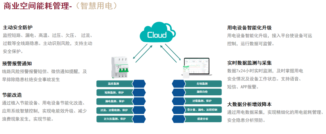 智慧用電:接入云平臺(tái),通過用電數(shù)據(jù)采集,平臺(tái)數(shù)據(jù)存儲(chǔ),實(shí)現(xiàn)精細(xì)化的用電能耗管理、安全隱患分析預(yù)防。